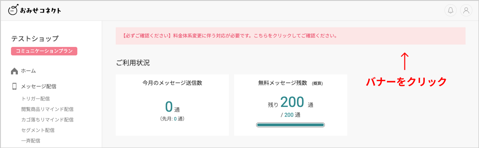 おみせコネクトダッシュボード( https://app.omiseconnect.jp/ )に 【必ずご確認ください】料金体系変更に伴う対応が必要です。こちらをクリックしてご確認ください。 (画像参照)のバナーが表示されている場合は、そちらをクリックしてください。