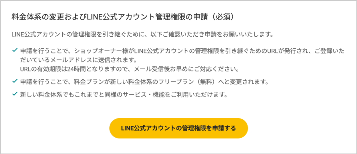 LINE公式アカウントの管理権限をショップ様に移したことで、今後LINE公式アカウントの有料プランをご利用いただく場合はお手続きが必要となります。