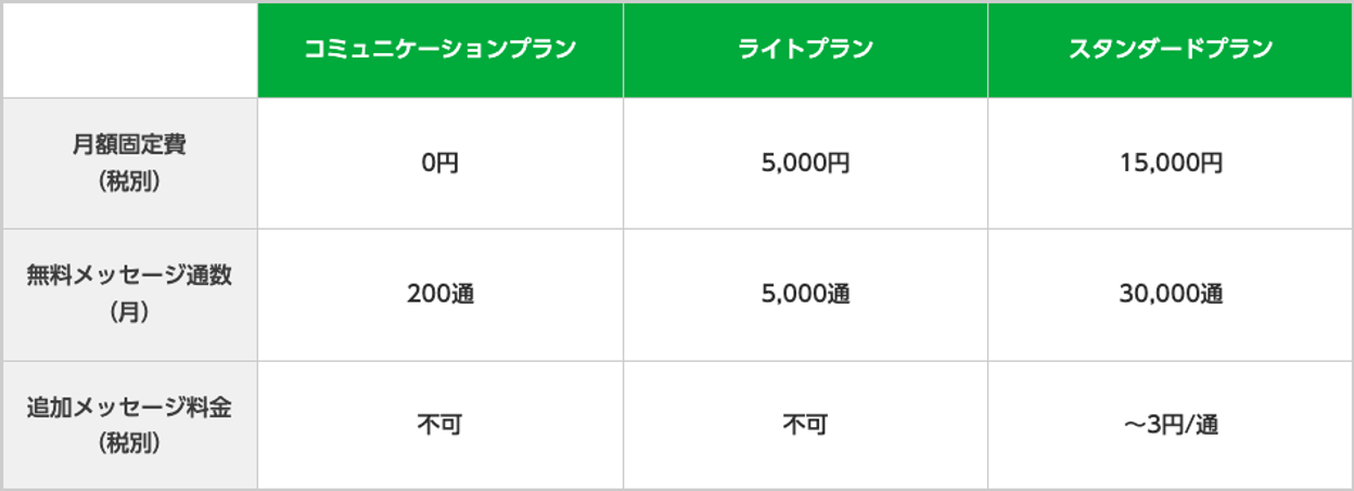 LINE公式アカウントの料金プラン https://www.lycbiz.com/jp/service/line-official-account/plan/