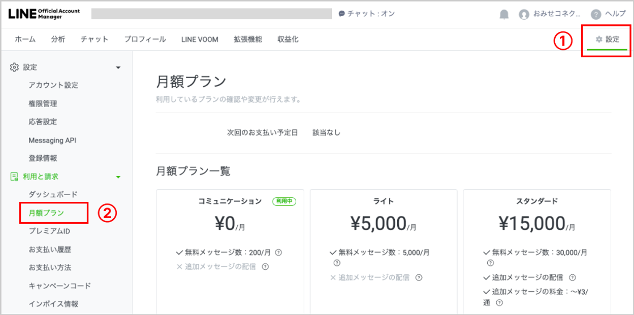 ただし、翌月1日より自動的に「コミュニケーションプラン」へと変更になりますので、継続して有料プランのご利用を希望されます場合には、「LINE Official Account Manager」よりプランの変更を行ってください。