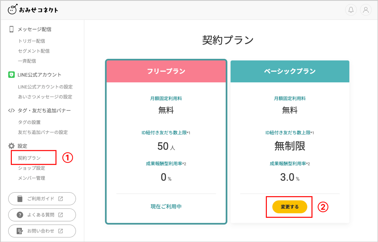 すでにLINEID紐付き友だち数が50人を超えているショップ様は、おみせコネクトの機能をご利用いただくには「ベーシックプラン」への変更が必要となります。