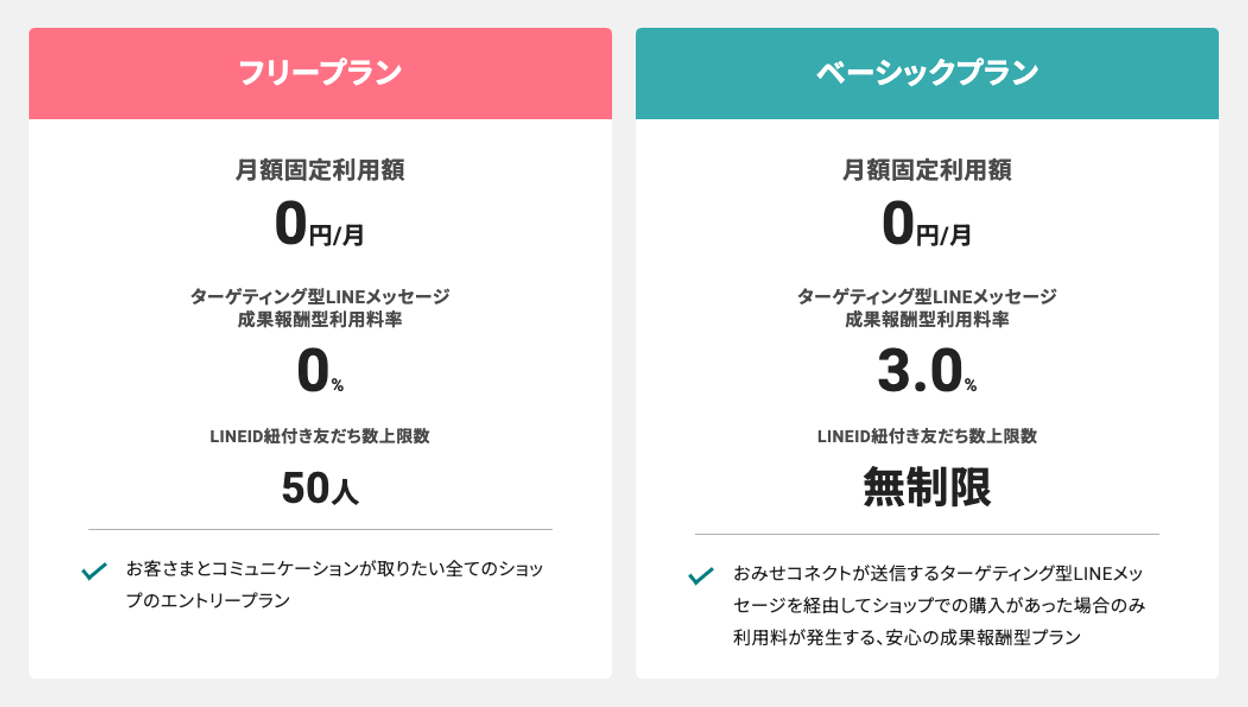 「ID紐付き友だち数」が50人以上の場合に適用されます。おみせコネクトが送信するターゲティング型LINEメッセージを経由してショップでの購入があった場合に、売上の3%を成果報酬としてお支払いいただきます。